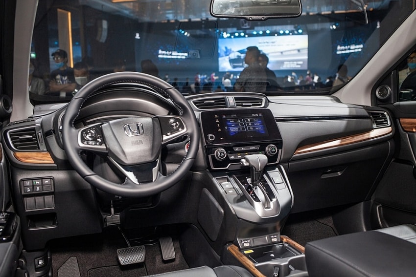 Bảng táp-lô Honda CR-V 2022 được thiết kế theo kiểu đối xứng. Trên bản tiêu chuẩn sử dụng chất liệu ốp nhựa màu kim loại, trong khi trên 2 bản cao cấp cho cảm giác sang trọng hơn với ốp gỗ. Trên thế hệ đương nhiệm, nhà sản xuất đã loại bỏ màn hình phụ phía trên và thay vào đó là 2 hốc gió điều hòa. Ngoài ra, cột A được làm mỏng, giật xéo về phía sau tạo tầm nhìn thoáng hơn cho người cầm lái. Để tạo sự thuận tiện cho người dùng, CR-V2022 cũng được trang bị đèn LED đọc sách cho hàng ghế trước và ghế sau.