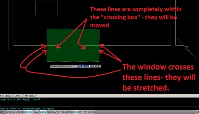 Here’s the rule to remember how this tool works. Whatever is completely within the crossing window gets moved. And whatever the crossing window is crossing gets stretched.