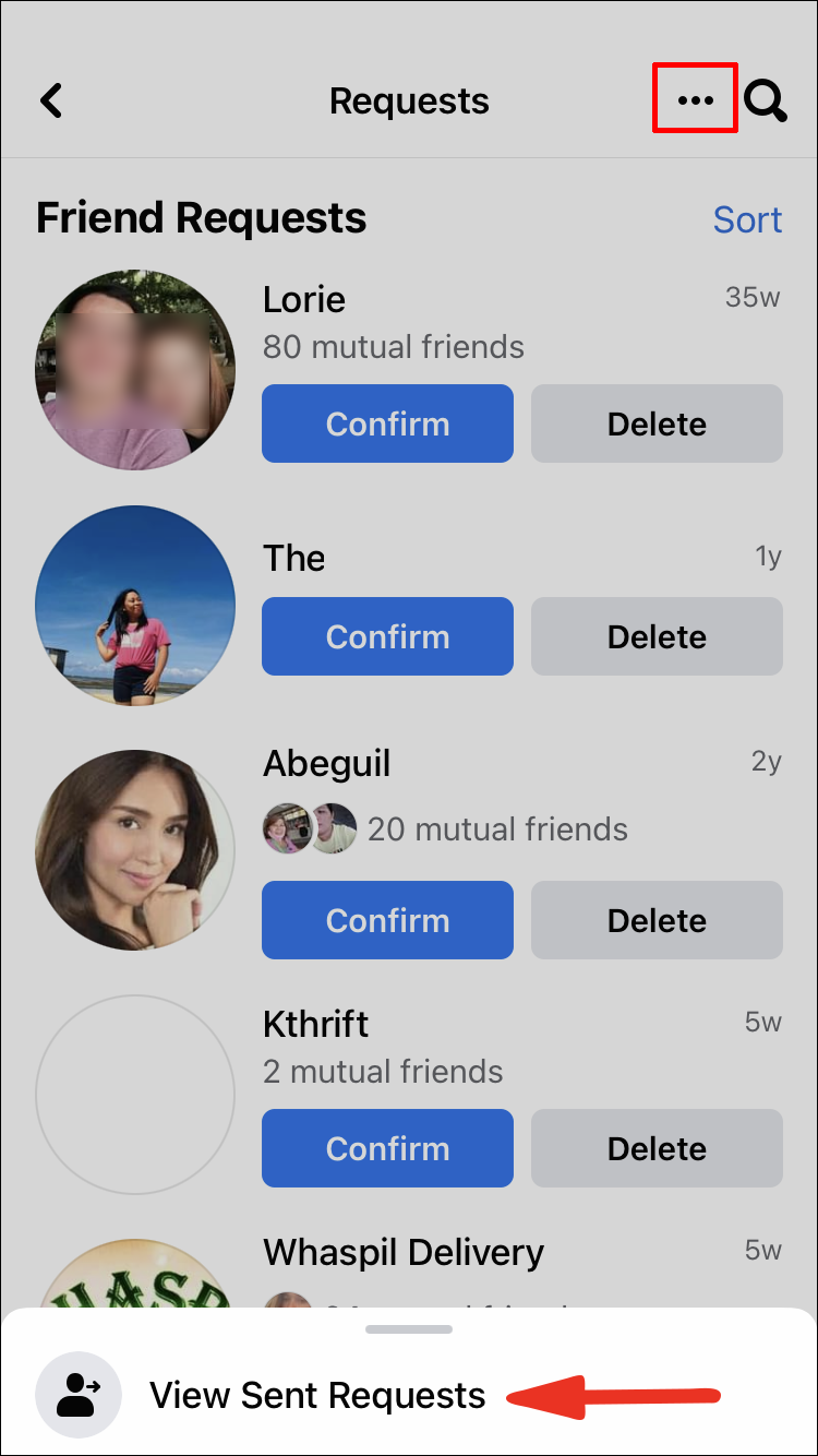 - Hit the three horizontal dots in the upper right part of your screen and tap the “View sent requests” option.
