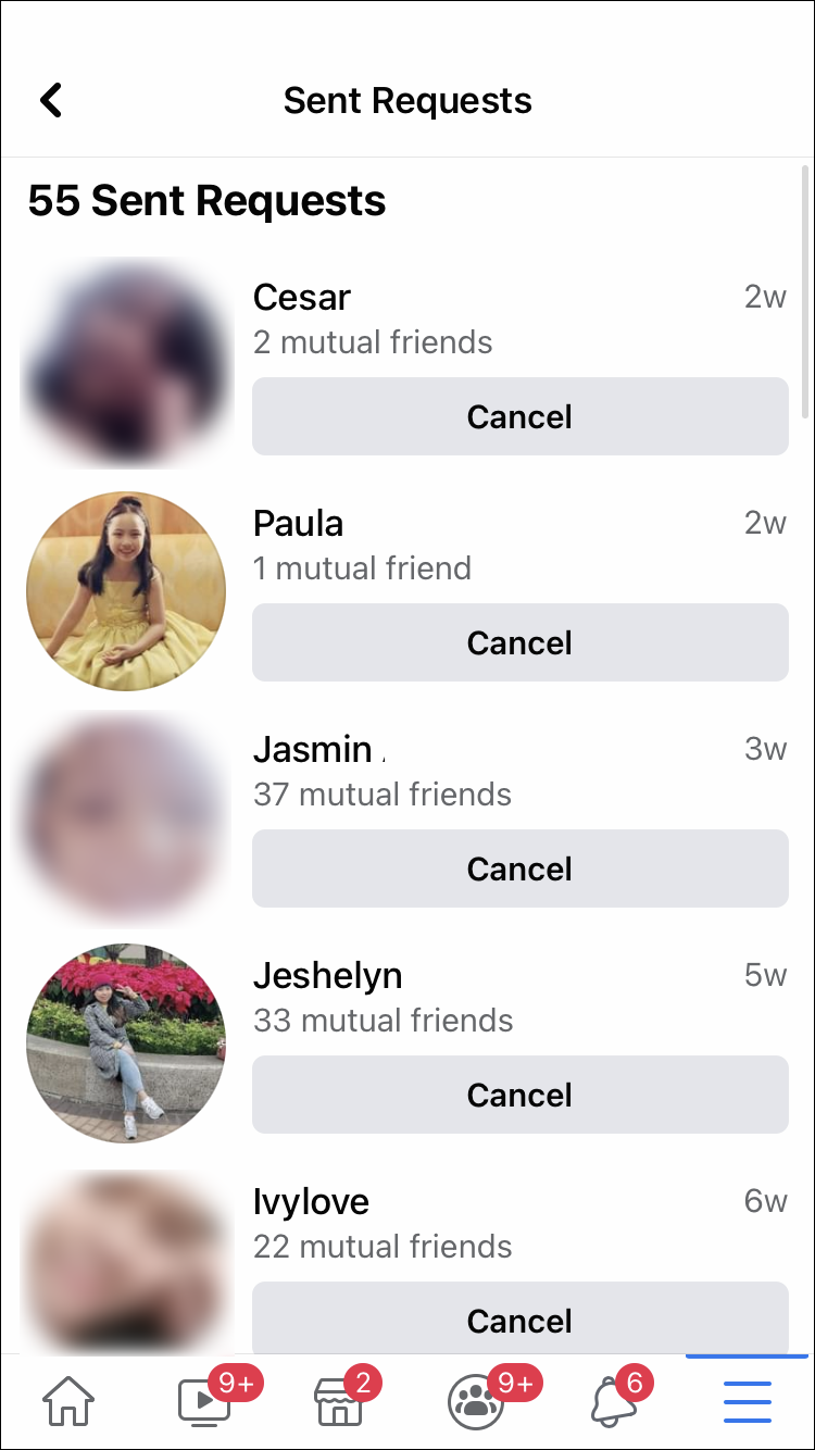 - You now see all pending friends requests you sent and can tap the “Cancel” button for each profile as desired.