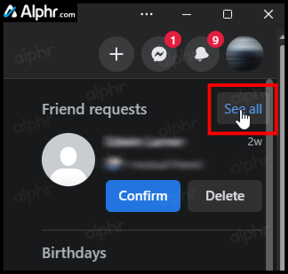 - Open the Windows “Facebook” app. If a “Friends requests” section appears in the top right corner, click on “See all” and skip to “Step 6.” The option may not always be there. If not, move to “Step 2.”