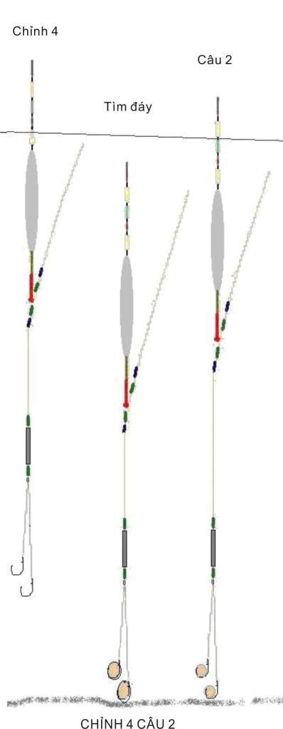 Chỉnh 4: Khi chỉ có lưỡi câu (không gắn mồi câu) thêm bớt chì lá sao cho phao nhô lên mặt nước 4 nấc phao và phải đảm bảo lưỡi câu lơ lửng không chạm đáy.Câu 2: Khi đã gắn mồi câu (trọng lượng mồi câu lớn hơn 2 nấc phao) thì phao sẽ chìm dưới mặt nước. Tìm đáy bằng cách kéo phao lên sao cho phao nổi lên mặt nước 2 nấc phao, lúc này mồi câu đã tới đáy. Khi hết mồi câu thì phao sẽ nổi lên 4 nấc phao.Một số điều cần lưu ý