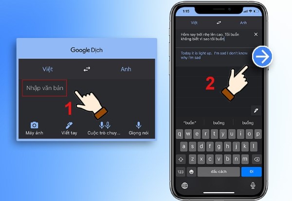 Chọn khung Nhập văn bản > Nhập vào nội dung văn bản cần dịch > Ấn biểu tượng có hình Mũi tên bên phải để việc dịch được tự động thực hiện.