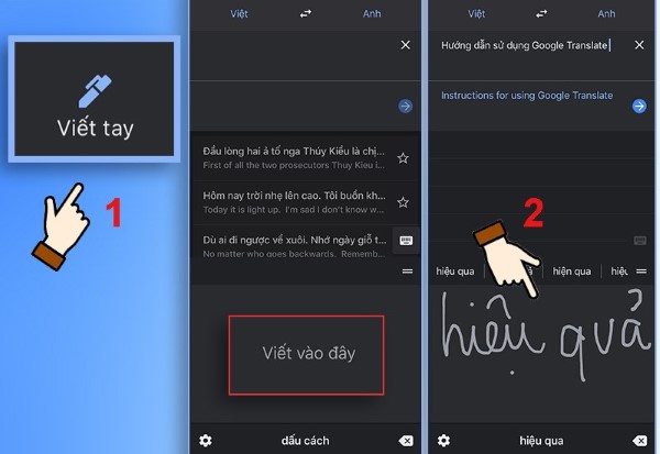 Chọn biểu tượng hình cây bút tượng trưng cho viết tay > Sử dụng thao tác với ngón tay hoặc bút cảm ứng để viết những nội dung muốn dịch vào vị trí ô Viết vào đây để thực hiện quá trình dịch.