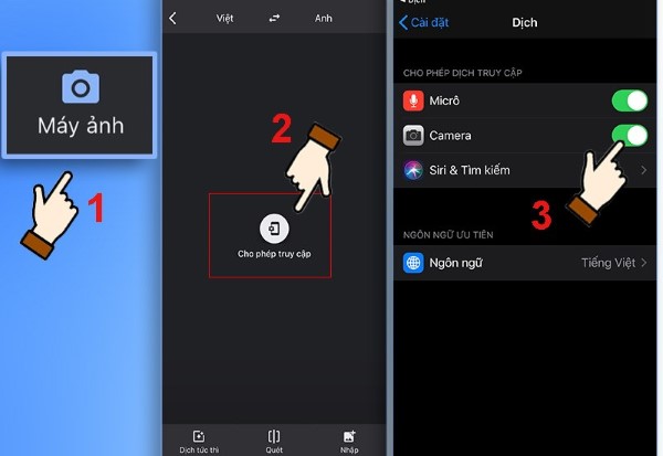 Chọn biểu tượng có hình micro (Giọng nói) > Chọn tiếp Cho phép truy cập > Thu nội dung văn bản cần dịch > Ấn vào biểu tượng hình Micro quá trình thu âm hoàn tất.