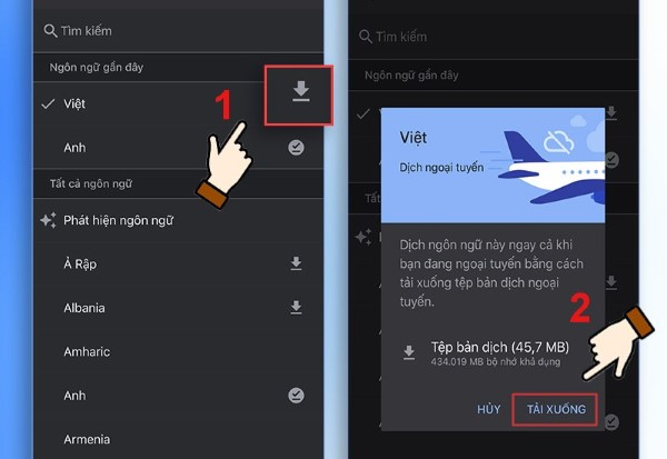 Chọn vào khung ngôn ngữ > Ấn chọn biểu tượng có hình tam giác ngược ở vị trí bên cạnh ngôn ngữ muốn tải về máy để có thể sử dụng khi ngoại tuyến > Chọn tiếp vào Tải Xuống. Sau khi quá trình tải hoàn tất, bạn có thể sử dụng những phương pháp dịch đối với ngôn ngữ đã được tải về không yêu cầu phải có kết nối mạng Internet để khả dụng.