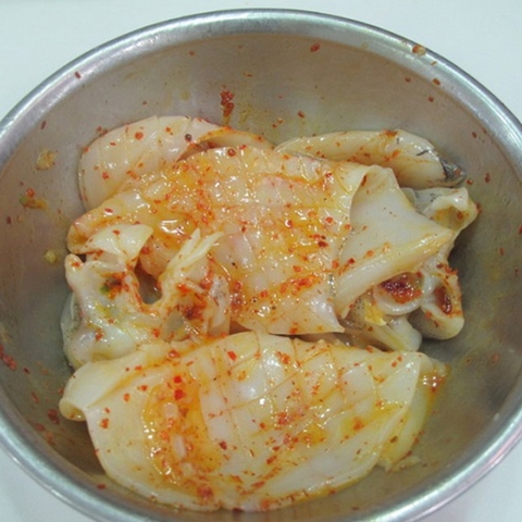 Cho vào ướp tiếp cùng 1 ít tỏi băm, dầu ăn và tiêu bắc xay. Thêm chút sa tế vào và ướp trong vòng 15p cho mực ngấm gia vị là được.