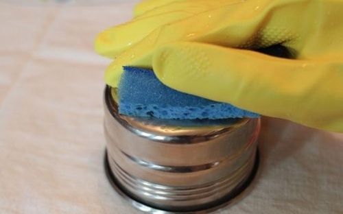 Nếu những vết keo dính trên kim loại mỏng, bạn có thể dùng chất tẩy Acetone thoa lên và kết hợp với miếng chà, chà liên tục lên chỗ bị dính cho đến khi sạch lớp keo dính đó.