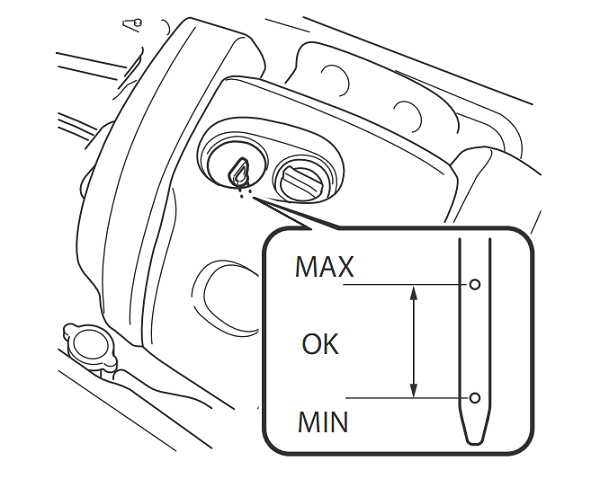 Kiểm tra mức dầu động cơ theo định kỳ. Khi kiểm tra dầu động cơ, nếu dầu động cơ vượt qua mức X trên quy thăm dầu, cần thay thế dầu động cơ. Điều này nên được thực hiện bởi chuyên viên kỹ thuật, nhà sản xuất khuyến cáo nên đem xe đến xưởng sửa chữa ô tô. Khi thay thế dầu động cơ, cần kiểm tra mức dầu trên que thăm dầu nằm trong khoảng MIN và MAX như hình bên dưới.