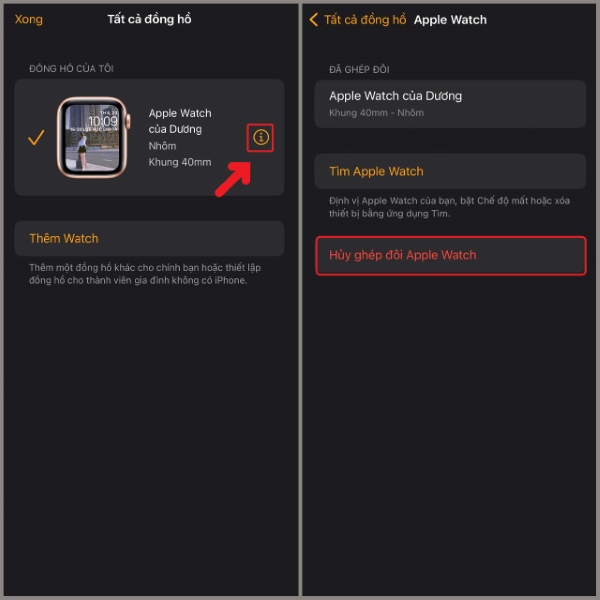 Bước 2: Nhấn chọn vào biểu tượng (i) bên cạnh tên đồng hồ Apple Watch muốn hủy kết nối > nhấn chọn Hủy ghép đôi Apple Watch là được.