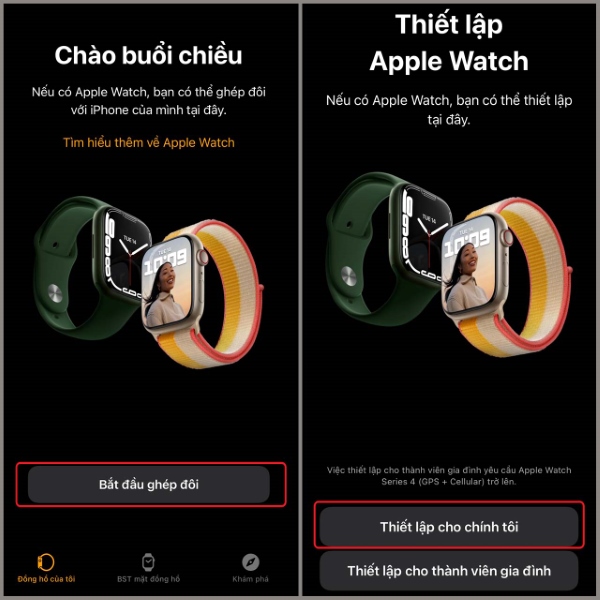 Bước 2: Trên iPhone, bạn mở ứng dụng Watch lên > nhấn Bắt đầu ghép đôi > chọn Thiết lập cho chính tôi hoặc Thiết lập cho thành viên gia đình tùy vào nhu cầu sử dụng của bạn.