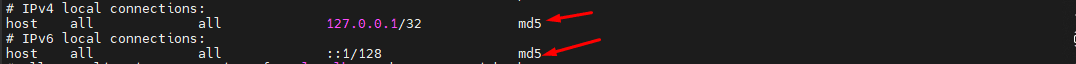 Thoát ra chế độ root và truy cập theo đường dẫn đó để sửa file cấu hình như sao. #vi /var/lib/pgsql/11/data/pg_hba.conf sửa đỗi giá trị của 2 dòng sau host all all 127.0.0.1/32 ident -->host all all 127.0.0.1/32 md5 host all all ::1/128 ident -->host all all ::1/128 md5
