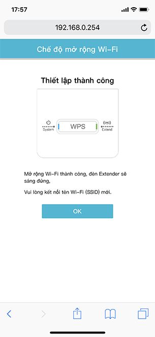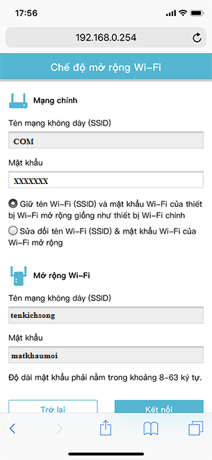 4.1 Nếu chọn giữ tên wifi và mật khấu của thiết bị wifi mở rộng giống như thiết bị wifi chính- nhấn kết nối tiếp tục cài đặt