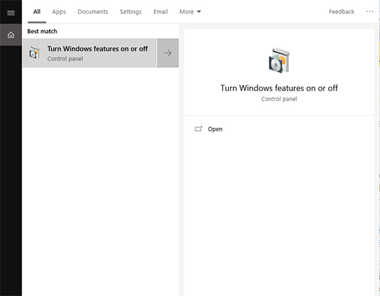 Bước 1: Các bạn nhấn tổ hợp phím Windows + S . Sau đó các bạn nhập Turn Windows features on or off vào ô tìm kiếm. Sau đó, các bạn click chạy Turn Windows features on or off.