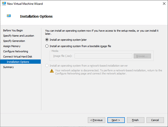 Bước 12: Tiếp theo, bạn sẽ cài hệ điều hành vào máy ảo tại mục Installation Options. Nếu bạn chưa có bản cài đặt của hệ điều hành (file .iso) thì bạn có thể chọn Install an operating System later để thực hiện nạp hệ điều hành sau khi tạo máy ảo. Còn nếu bạn đã có file cài đặt (.iso) của hệ điều hành thì bạn có thể chọn Install an operating system from a bootable CD/DVD-ROM > Image file (.iso) và chọn Browse....để chỉ định đường dẫn đến file iso. Sau khi chọn xong bấm Next.