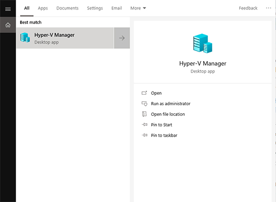 Bước 3: Sau khi khởi động lại máy. Các bạn nhấn tổ hợp phím Windows + S và nhập Hyper-V Manager vào ô tìm kiếm. Sau đó các bạn mở ứng dụng này lên.