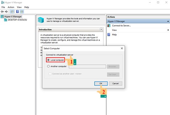 Sau đó, cửa sổ Select Computer hiện lên, bạn chọn Local computer (1) rồi click OK (2) để kết nối với cùng máy tính đang dùng.