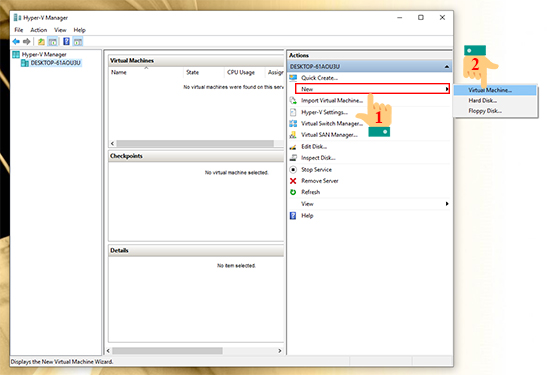 Bước 5: Tiếp theo, bạn cần tạo một máy ảo mới bằng cách chọn New (1) và chọn tiếp Virtual Machine (2) ở cửa sổ bên phải.
