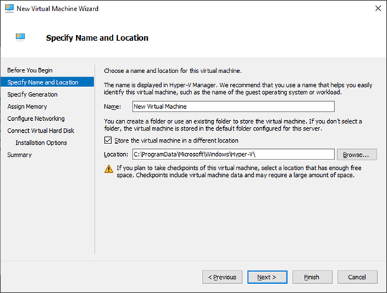 Bước 7: Tiếp đến, ở giao diện Specify Name and Location, các bạn đặt tên máy ảo ở mục Name và chọn vị trí lưu máy ảo bằng cách tick vào Store the virtural machine in a different location và nhấn vào Browse... để chọn vị trí lưu mới. Sau đó các bạn chọn Next.