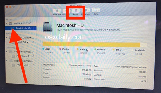 Chọn Macintosh HD (hoặc tên của ở đĩa Mac), Chọn Erase.