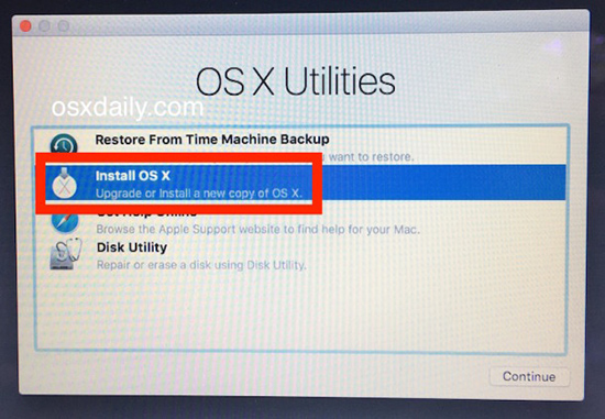 Tại phần OS X utilities bạn chọn Disk Utilities > Continue.