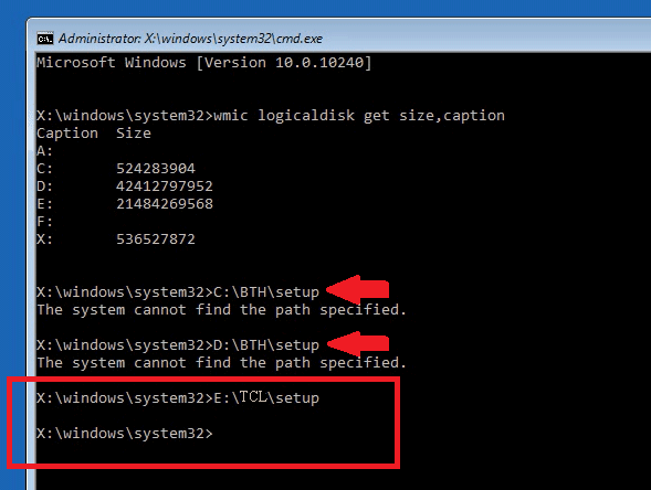 Tiếp theo bạn hãy gõ lần lượt theo danh sách Tên ổ đĩa:\TCL\Setup rồi ấn Enter liên tục cho tới khi sau khi ấn Enter bạn không còn thấy dòng The System Cannot find the path specified. Chúng ta sẽ thao tác theo các lệnh sau: