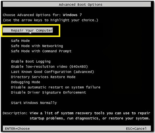 - Các bạn khởi động lại máy và liên tục ấn F8 cho tới khi trên màn hình xuất hiện màn hình đen như hình bên dưới. Sau đó bạn dùng phím mũi tên để di chuyển và nút Enter để chọn phần Repair Your Computer.Tại đây nếu như bạn vẫn không thấy Repair Your Computer thì bạn ấn nút nguồn máy tính để resert lại máy và ấn F8 lại một lần nữa xem đã có chưa.