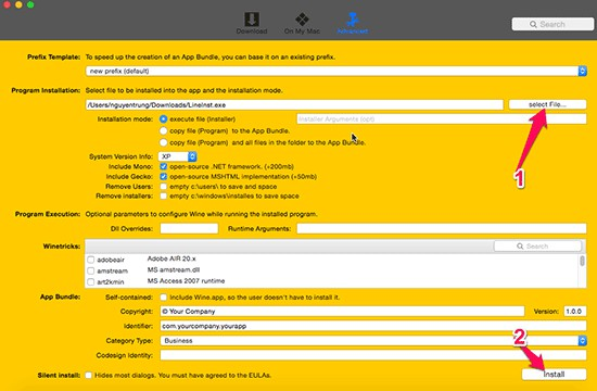 Chọn vào Select file và tìm đến file .exe bạn cần chạy trên Mac OS > Install