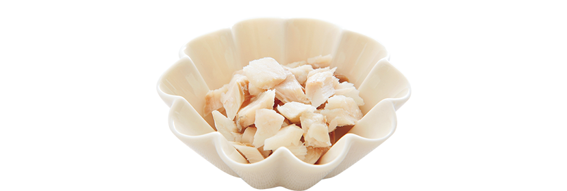 Dùng dĩa để lọc bỏ gân thịt gà, sau đó thái miếng nhỏ, cho vào bát, thêm chút nước, đậy ni-lon kín và cho vào lò vi sóng quay chín.