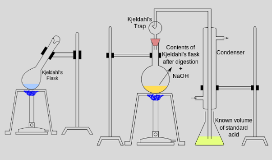 - Sự phân hủy hoá học của mẫu hoàn tất khi môi trường ban đầu rất tối đã trở nên rõ ràng và không màu. Dung dịch này sau đó được chưng cất với một lượng nhỏ natri hydroxyd, chuyển muối amoni thành ammonia. Lượng amoniac hiện diện, và do đó lượng nitơ có trong mẫu, được xác định bằng phép chuẩn độ. Sự kết thúc của bình ngưng được nhúng vào một dung dịch axit boric hoặc acid sulfuric. Amoniac phản ứng với axit và phần còn lại của axit sau đó được trung hòa bằng NaOH 0.1N