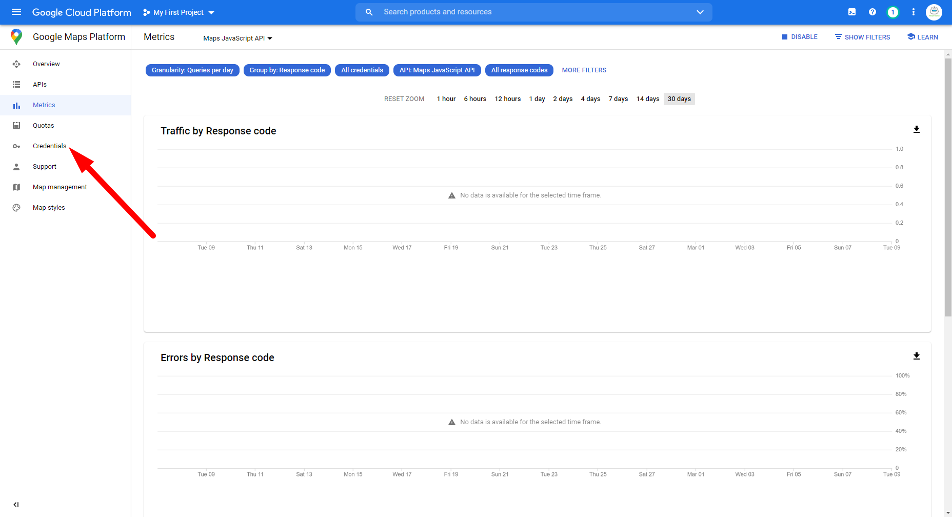 Bước 14: Sau khi bật đủ hãy click vào tab "Credentials" trên thanh sidebar bên tay trái như mũ tên đỏ mình đang trỏ vào.