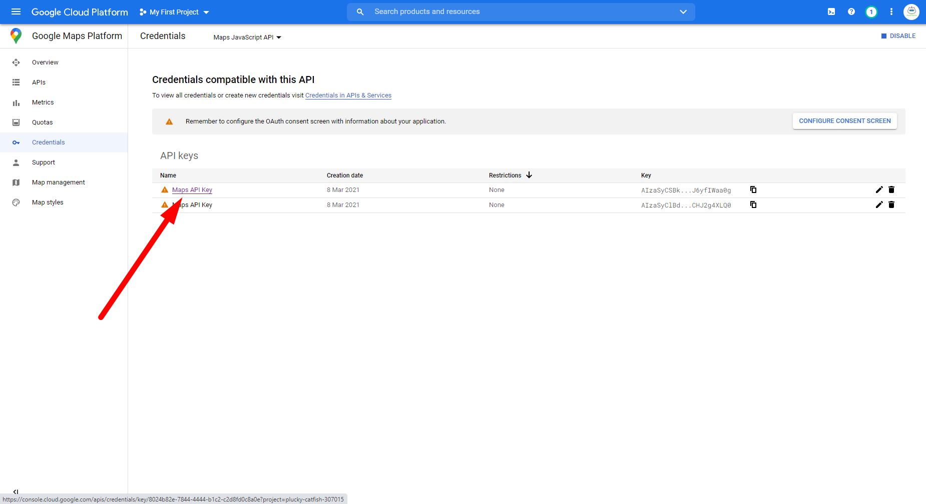 Bước 15: Ở tab Credentials này bạn chọn API sẽ dùng. (Có thể bạn chọn API vừa nãy đã lưu lại ở bước 11). Click vào tiêu đề như ảnh mình họa.