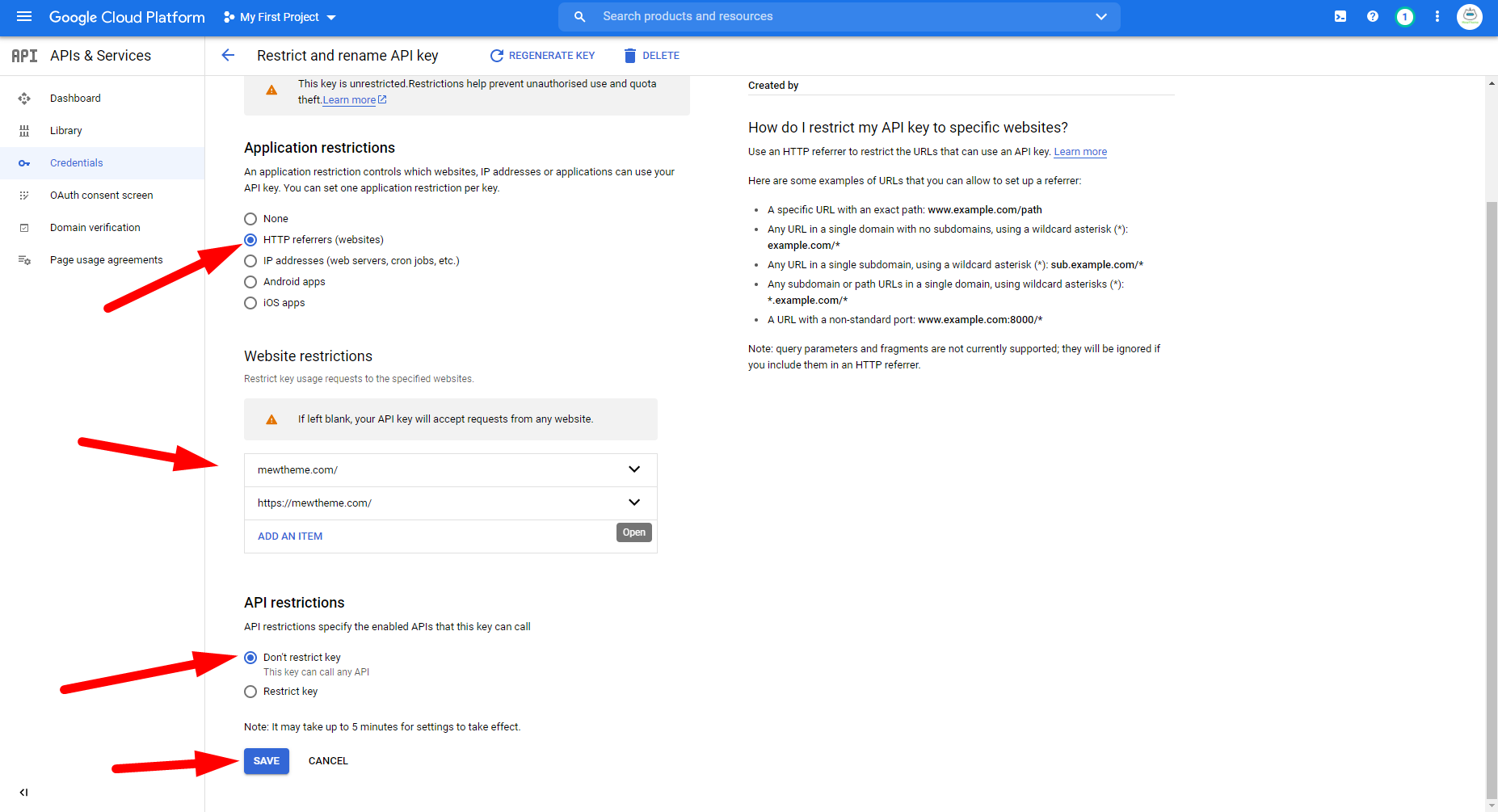 Bước 16: Ở đây chúng ta sẽ thiết lập cho API bạn sẽ dùng bằng các thông tin cơ bản: (Website => Tên miền Website => Không giới hạn) và lưu lại