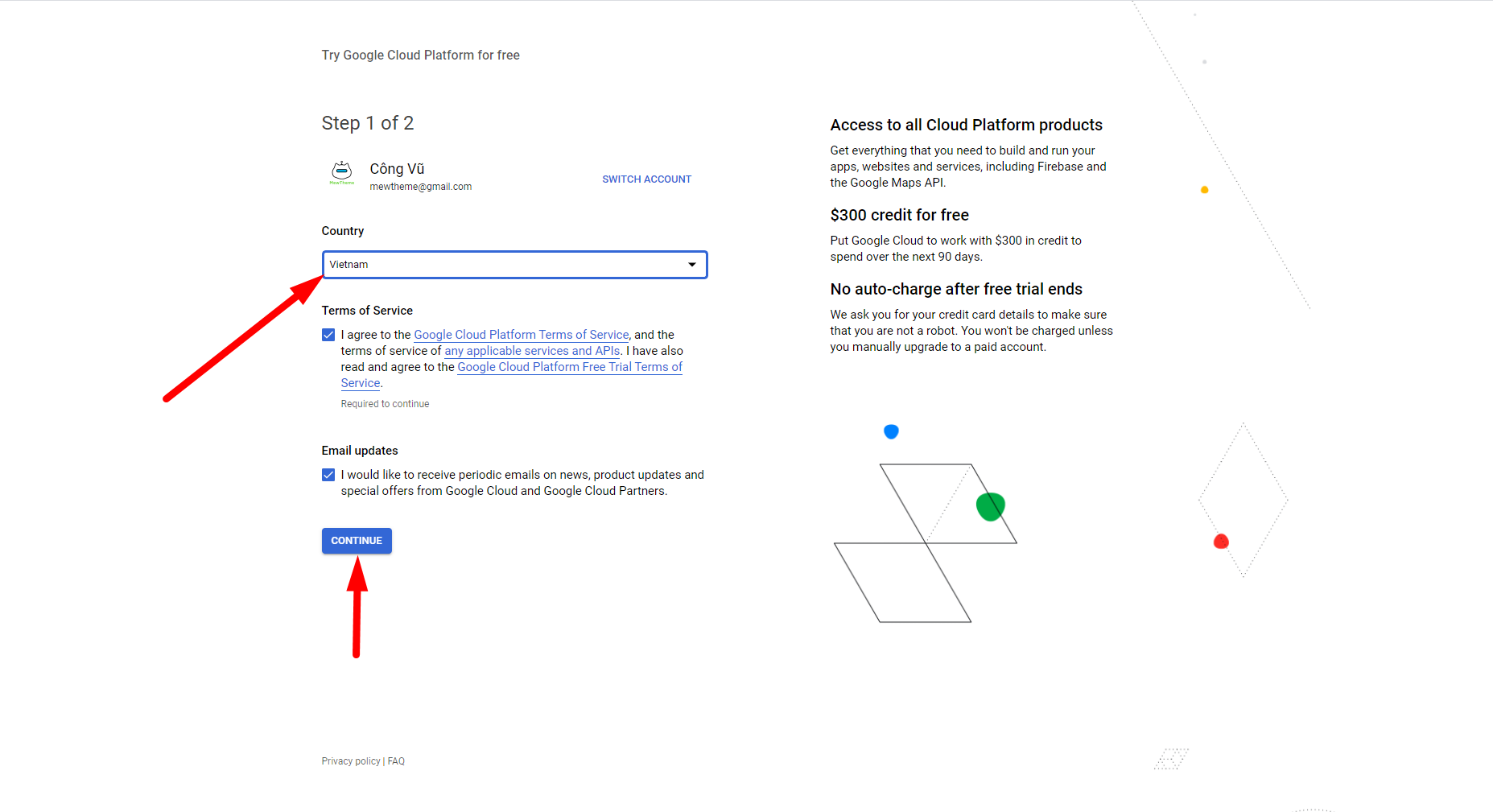 Bước 5: Chọn Quốc Gia của bạn, đồng ý điều khoản từ phía Google và chọn "tiếp tục" (Continue)