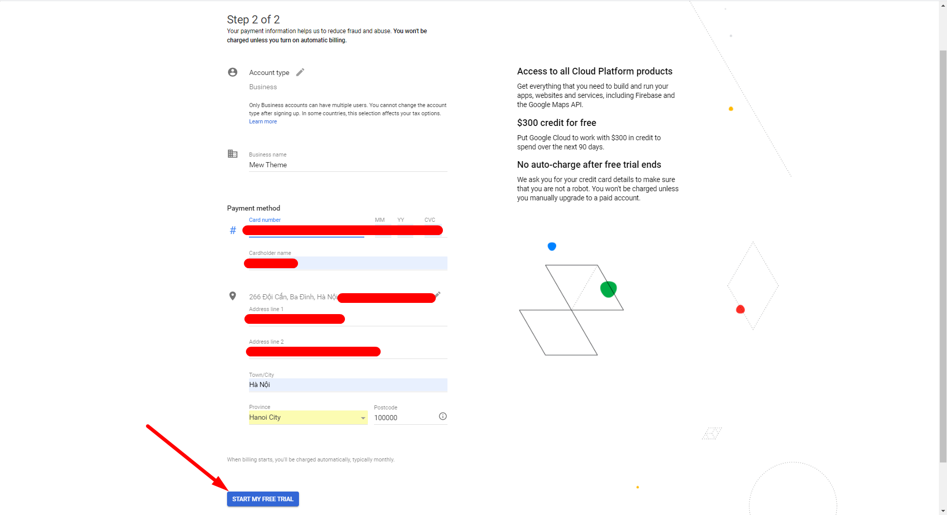 Bước 6: Đặt tên cho Business của bạn. Cung cấp thông tin về thẻ thanh toán Quốc tế mà bạn có cùng các thông tin cơ bản về địa chỉ, thành phố, mã zip rồi click "Start my free trial"