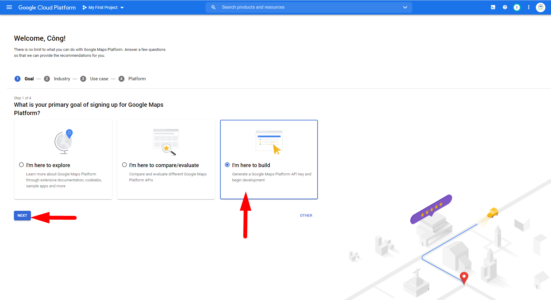 Bước 7: Bước này bạn hãy lựa chọn mục theo ảnh minh họa của mình (Lựa chọn việc sử dụng API dưới mục đích nhà phát triển)