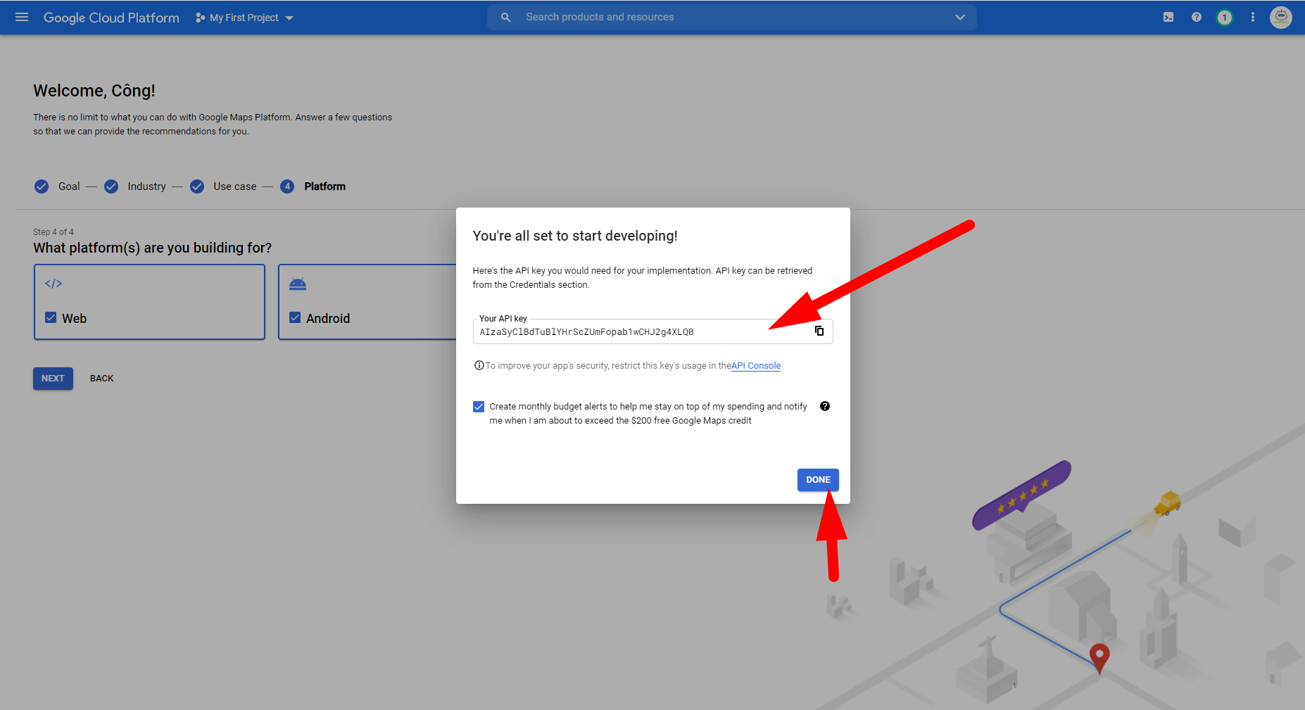 Bước 11: Sau khi next ở bước 10 sẽ hiện ngay 1 API key cho bạn. Bạn có thể coppy API này note lại và ấn DONE nhé.