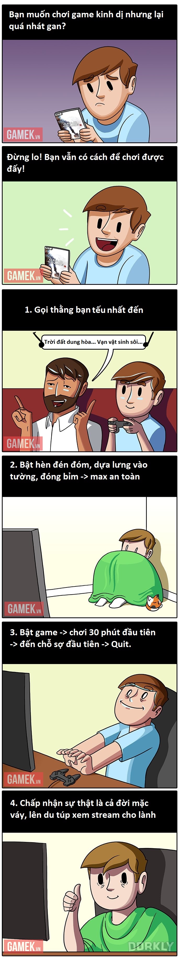 Kích thích, hồi hộp, kịch tính, sợ hãi... Có lẽ chẳng thể loại game nào lại mang đến nhiều cảm xúc cho chúng ta như game kinh dị. Đáng tiếc, phong cách này lại không sinh ra dành cho mọi game thủ, đặc biệt là những người kém gan dạ. Trong chùm tranh vui dưới đây, chúng ta sẽ cùng xem một số bước hướng dẫn để chơi được game kinh dị rất "hiệu quả" dành cho bộ phân game thủ thỏ đế.