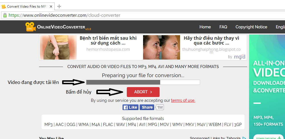 Đợi một thời gian để tải video lên trang web, bạn có thể nhấn nút ABORT để hủy tải lên và chọn video khác.