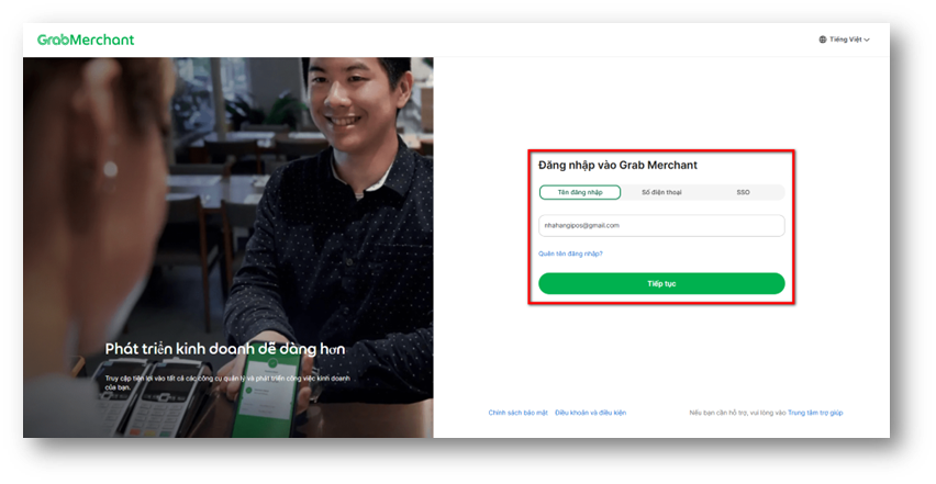 - Truy cập vào trang “https://merchant.grab.com/portal” -> Đăng nhập tài khoản owner của grab merchant vào