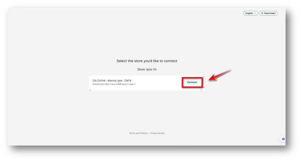 - Chọn vào “Connect” cửa hàng bạn muốn kết nối Lưu ý: Trường hợp bạn có nhiều cửa hàng, bạn phải đảm bảo cửa hàng iPOS và Grabfood khớp với nhau