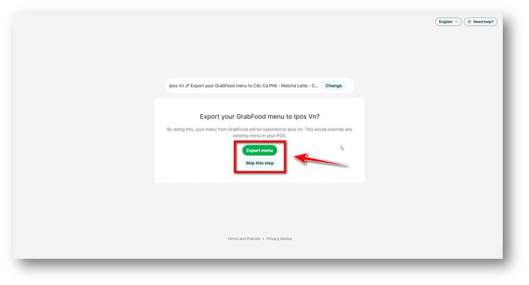 Chọn vào “Export menu” nếu muốn lưu lại menu Grabfood, chọn “Skip this step” để bỏ qua bước này