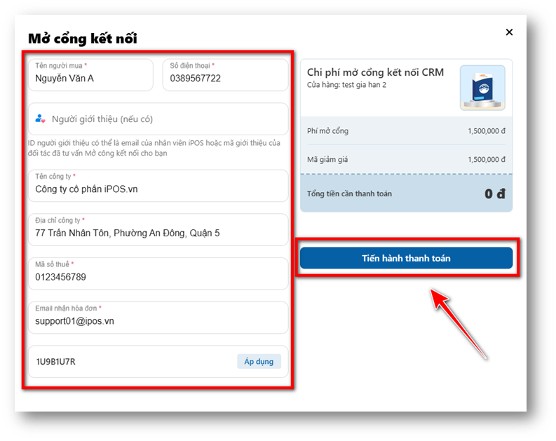 Người giới thiệu: bạn có thể điền email ipos của nhân viên iPOS hoặc mã giới thiệu của đối tác nếu có