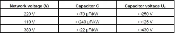 Điều này tương đối quan trọng vì nếu chúng ta chọn tụ điện có điện dung không phù hợp tức quá thấp hay quá cao sẽ ảnh hưởng đến hiệu suất của động cơ và có thể làm cháy cuộn dây động cơ . Dưới đây là bảng tham khảo giá trị điện dung của tụ điện. chúng ta phải xem xét kỹ điện áp làm việc cũng như điện áp kết nối để tránh làm hư hỏng động cơ hay bản thân tụ điện.