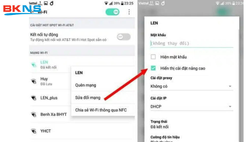 Bước 2: Nhấn giữ vào thiết bị wifi mà bạn muốn thay đổi. Sau đó, màn hình điện thoại sẽ hiển thị 1 cửa sổ cho người dùng lựa chọn chức năng muốn thực hiện. Ở đây, bạn nhấn “Sửa đổi mạng” và tiếp theo tick chọn “Hiển thị cài đặt nâng cao” như hình dưới đây: