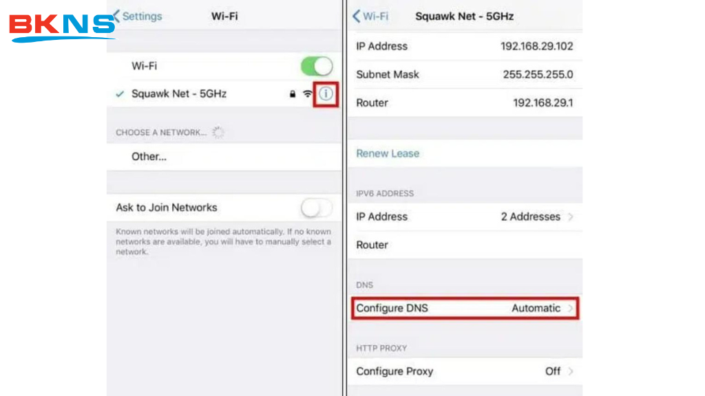 Bước 2: Trên mạng wifi bạn muốn đổi DNS, chọn vào biểu tượng chữ i. Kéo xuống dưới chọn dòng “Configure DNS”