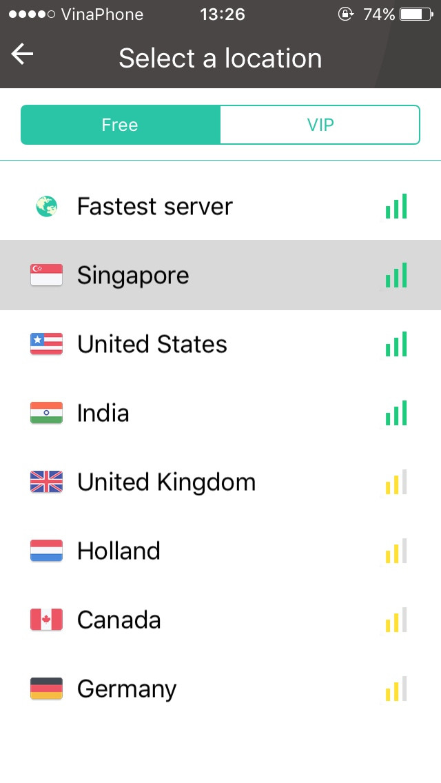 Sau khi cài đặt cấu hình VPN xong điện thoại bạn đã được kết nối với 1 Mạng riêng ảo server nước ngoài nên sẽ khắc phục được lỗi. Để thay đổi Server sang các nước khác manh hơn, các bạn vào Menu chọn Server List
