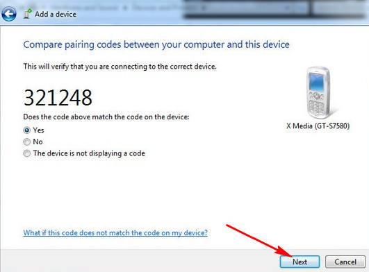 Bước 6: Lúc này trên máy tính sẽ xuất hiện thông báo, thiết lập kết nối Bluetooth với mã code hiển thị trong bản, bạn cần click chọn Yes sau đó chọn Next để tiếp tục.
