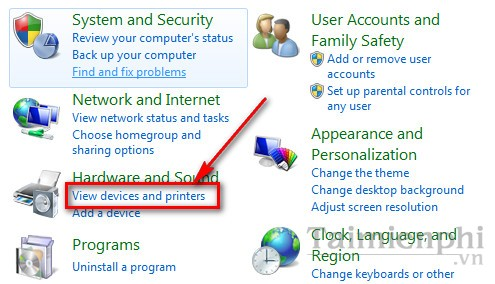Bước 3: Trên máy tính bạn click Start ---> Control Panel ---> View devices and Printers