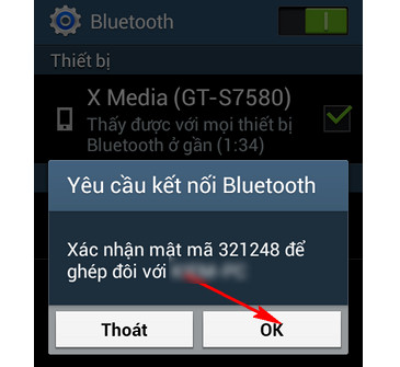 Bước 7: Đồng thời khi đó trên Smartphone Android cũng xuất hiện một thông báo với mã code xác nhận trùng với mã trên laptop. Bạn click Ok để thiết lập kết nối